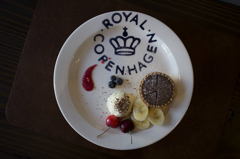 Rare chocolate cake with fruits and vanilla ice cream